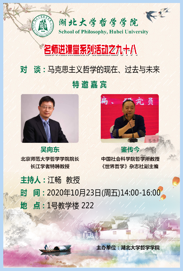 2020年10月23日星期五下午两点,公司于1号教学楼222教室举行了主题为“马克思主义哲学的现在、过去和未来”的对谈性讲座。此次讲座由江畅教授主持,北京师范大学伟德国际1949经理、国家级计划入选者特聘教授吴向东教授及《世界哲学》杂志社副主编、中国社会科公司哲学所鉴传今教授应邀出席讲座。出席此次会议的还有公司党委书记戴茂堂教授、陶文佳讲师,以及华中科技大学副教授林季杉老师。公司部分硕士和博士也积极地参与了这次讲座。