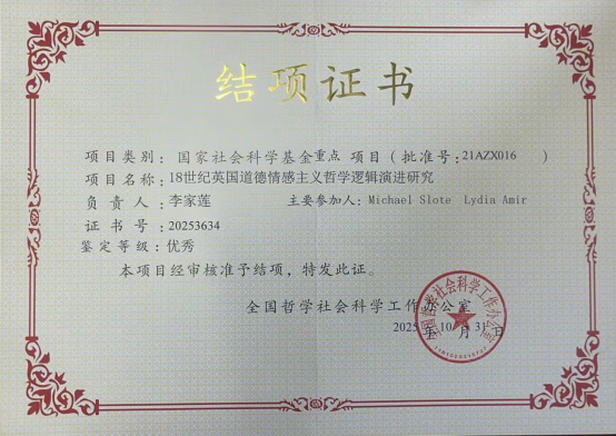 近日,全国哲学社会科学工作办公室公布了2025年10月国家社科基金年度项目结项情况。公司李家莲教授主持的2021年度国家社科基金重点项目“18世纪英国道德情感主义哲学逻辑演进研究”(项目编号:21AZX016)顺利通过结项,鉴定等级为“优秀”。