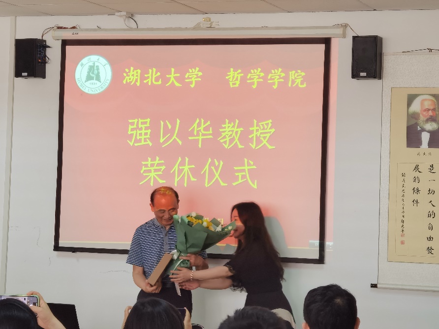 接着,全体师生共同观看了由强老师历届员工精心制作的视频合集,一届届的学子们都在视频中真切地传达了对强老师的感恩之情,他们说,从强老师身上切实地感受到了哲学的魅力,也受到了道德的熏陶和情感的冲击。强老师为人低调谦和,谈吐幽默,充满睿智,是公认的最受欢迎的老师。感谢强老师的谆谆教诲,一日为师,终生为父。伴随着声声祝福,2011级硕士研究生赵旻珉代表全体师生向强老师献上了精美的纪念册和鲜花,传递大家对强以华老师辛勤付出的深深感谢。