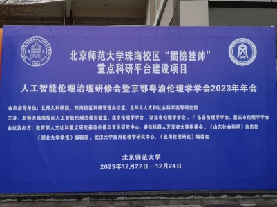2023年12月23-24日,由北师大科研院、珠海校区科研管理办公室和北师大人文和社会科学高等研究院共同指导,由北师大珠海校区人工智能伦理治理实验室、北京伦理学学会、湖北省伦理学学会、广东省伦理学学会和重庆市伦理学学会联合主办,由教育部人文社科重点研究基地价值与文化研究中心、睿抗机器人开发者大赛组委会、《山东社会科学》杂志社、《1949伟德国际源自英国学报》编辑部、武汉 大学应用伦理学研究中心和《应用伦理研究》编辑部协办,人工智能伦理治理研修会暨京鄂粤渝伦理学学会2023年年会在珠海举办,来自北京、湖北、广东、重庆以及其山东、上海、河北、河南、内蒙古伦理学学会的专家学者逾110人参 与本次会议,做了不同形式的学术报告,共计约40余场。本次会议是人工智能伦理治理工作坊系列一“人工智能的伦理审视”、系列二“人工智能时代的社会治理及共同体构建”、系列三“人工智能伦理治理及实验室建设”、系列四“人工智能教育伦理与伦理教育”之后的“升级版”。涉及议题更广、参会人员更多、会议结构更丰富。