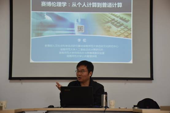 11月9日上午,湖南师范大学道德文化研究中心教授、公共管理公司副经理、人工智能道德决策研究所所长李伦教授应邀来到伟德国际1949讲学,此次讲座主题为“赛博伦理学:从个人计算到普适计算”,由公司余卫东教授主持,李家莲副教授和16级硕士参加了此次讲座。