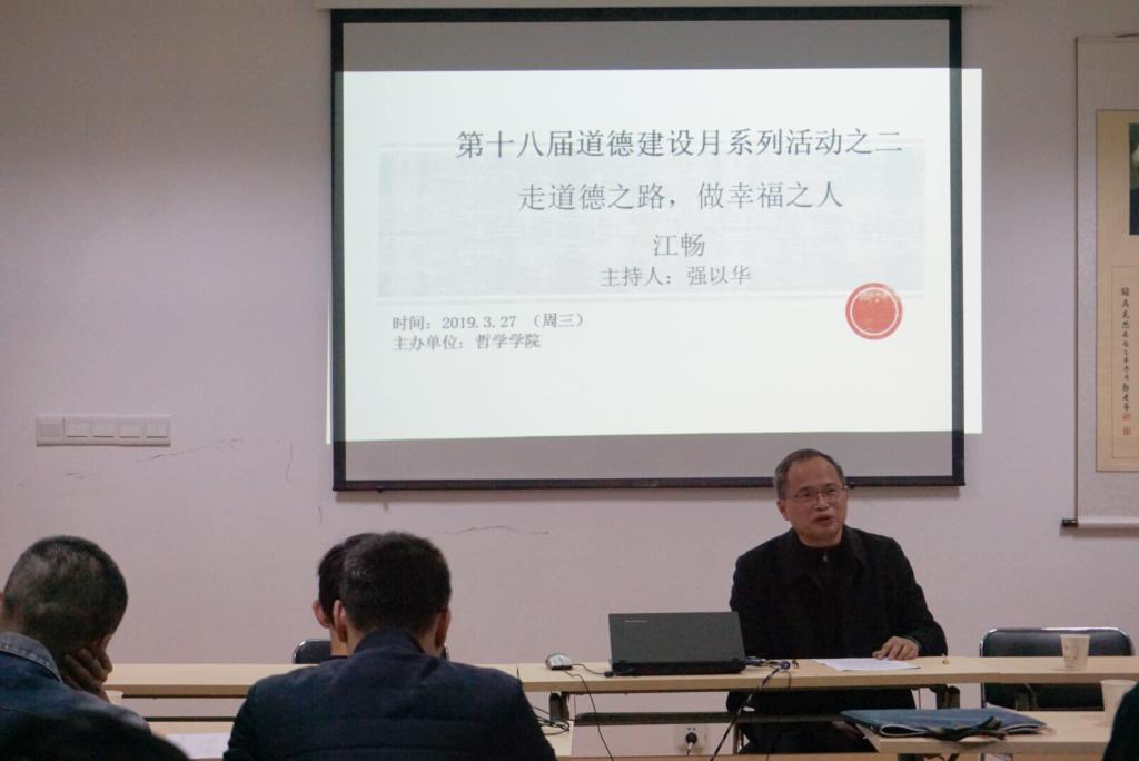 2019年3月27日星期三下午四点半,第十八届道德建设月系列活动之二于哲院D2008室举行。本期活动内容是由伟德国际1949江畅教授带来的主题为 “走道德之路,做幸福之人”的讲座。公司部分师生共同参加了此次讲座。