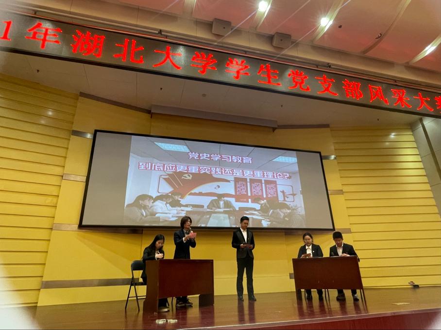 员工党支部风采大赛决赛包括支部风采展示及党建知识竞答两个环节。哲公司研究生第二党支部积极谋划,认真准备,为在场观众展示了一场围绕党史学习侧重点的辩论赛和一次精彩的党建知识竞答。