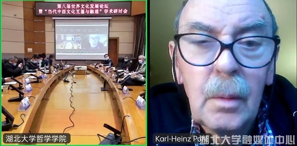 随后举行的论坛围绕“当代中西文化互鉴与融通”这一主题,彭富春、帕顿、江怡、顾彬、邓晓芒、侯绿曦、朱志方、卜松山等国内外学者,分别以《论共生》《文化概念分析:决定、德里达和道家》《在文明互鉴中看中国文化遗产的继承和保护》《交流是可能的吗?——略谈了解与误解》《从中西“是论”之别到“语言学之后”》《音乐在中西世界对话中的核心作用》《中国文化与中国科技发展》《跨文化对话的反思》为题做了学术报告。在交流与讨论环节,线下和线上的各位学者就发言专家的观点提问,并展开了热烈讨论。