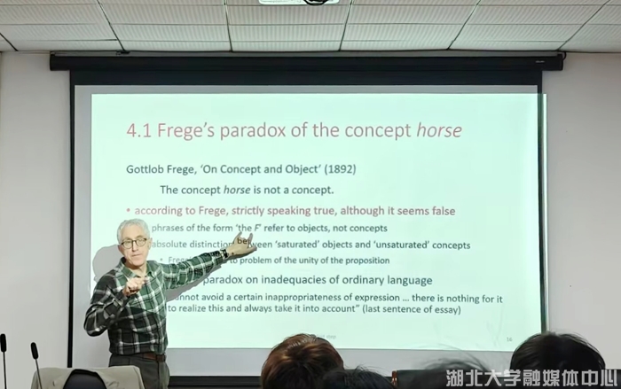 讲座中,毕明安教授介绍了弗雷格作为现代逻辑学创立者的主要贡献,阐述了弗雷格如何推进逻辑主义规划,深入探讨了弗雷格体系产生的两大哲学难题及解决方案:罗素悖论与“马”的概念悖论。毕明安教授指出,弗雷格的工作卓越地展示了哲学创造力往往源于发展一个强有力的核心类比。这种类比催生量化逻辑,但若将其过度推演为绝对的形而上学教条,便会产生思想上的悖论与哲学上的混淆。因此,理解分析哲学的历史,正是为了学会审视这些奠基性思想的成就与局限性。