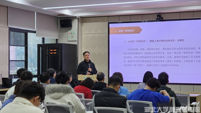 吴根友教授以《“世界历史中国时刻”的精神自觉与批判性考察——人文精神的中国声音》为题,从马克思主义历史哲学视域,系统梳理“世界历史”从“欧洲时刻”“美欧时刻”到“世界历史中国时刻”的演进脉络,解读人文精神的中国声音。他表示,“中国时刻”是责任担当,在世界百年未有之大变局加速演进背景下,可为世界提供更具包容性的“中国方案”。吴根友教授还以赵汀阳著作《天下体系》与陈赟著作《文明论的历史哲学》为例,剖析了中国学者在政治哲学与历史哲学领域的理论回应,为“中国时刻”的精神自觉提供重要启示。整场报告围绕“中国时刻”的责任内涵、物质与精神的辩证关系、天下观与民生的现实关联展开,体现了人文学科回应时代命题的思辨深度与人文关怀。